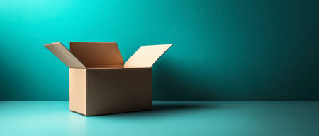 An open cardboard box sits on a teal surface, illuminated by soft light. The uncluttered setting enhances the focus on the box, evoking curiosity about its contents.
