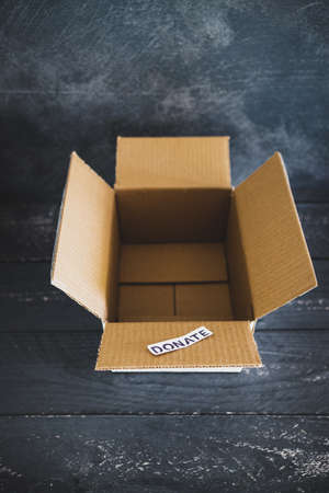 charity donation and decluttering items to be thrifted concept, empty box with Donate label ready to be filled with second-hand items