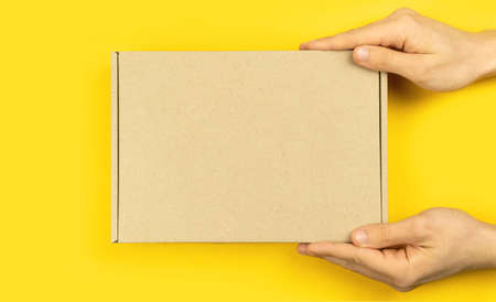 Delivery man hands with cardboard box mockup, top view. Yellow table background. Shipping and delivery concept, copy space