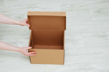 Open brown box with space on blurred background, empty paper box, simple packaging design