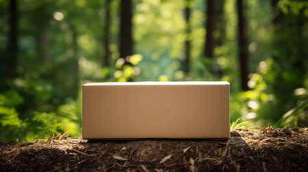 A blank eco-friendly package resting on a fallen tree in a vibrant forest.