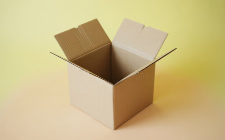 The an open cardboard box with its flaps raised, revealing its empty interior. The box is placed against a smooth, yellowish background. The box is primarily brown with a light-colored interior. The overall composition is simple and minimalistic, highlighting the box's structure and the soft, neutral tones of the background.
