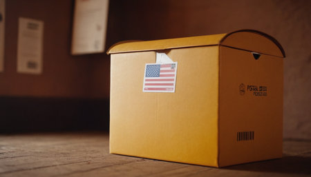 Cardboard box with United States flag on wooden table. Selective focus.