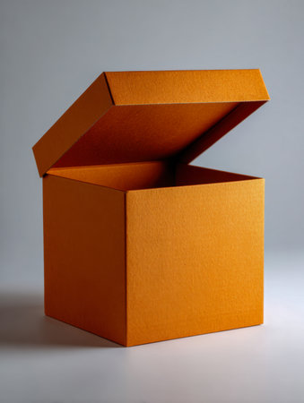 A vivid orange cube-shaped container with a lifted lid reveals a spacious, unfilled interior, ideal for festive presentations or creative packaging ideas against a simple