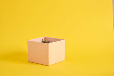 Cute Hamster in gift box yellow background. copy space Dzungarian hamster ears stick out of the box