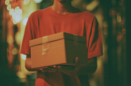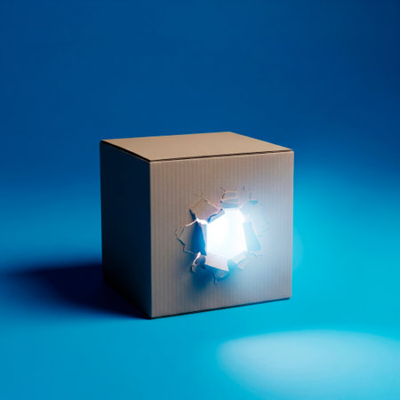 A cardboard box stands open, releasing a warm, glowing light in the darkness of a cozy room, creating a magical preparation for a surprise reveal.