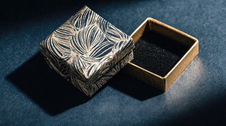 An exquisite decorative gift box featuring a stunning blue and gold leaf pattern, elegantly placed open on a dark surface, perfect for showcasing special gifts and moments.