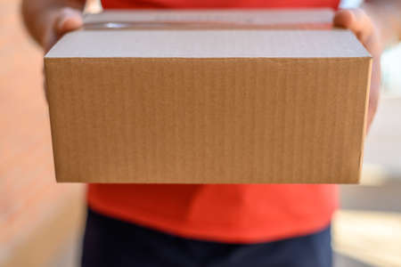 Close-up of cardboard package. Home delivery concept