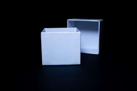 White gift box with open lid on black background.