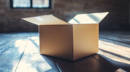 Open cardboard box on a wooden floor in a room with sunlight.