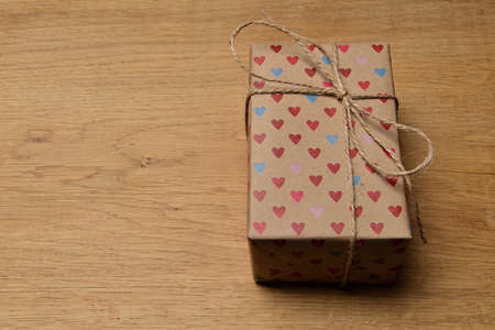 Gift craft box tied with jute close-up in female hands. Concept: gift, delivery, purchase