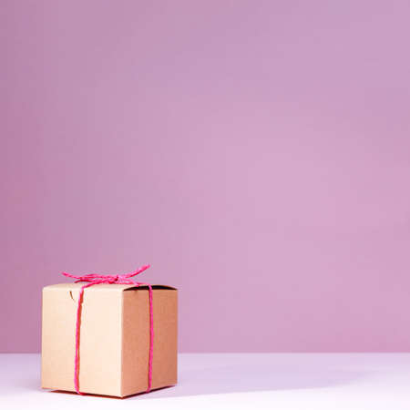 Craft cardboard gift box on the solid pink background. Holiday and gift concept. Square
