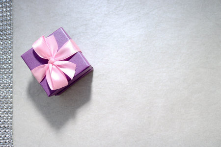 Violet gift beautiful festive cardboard small gift box with a bow on a light gray background. The background.