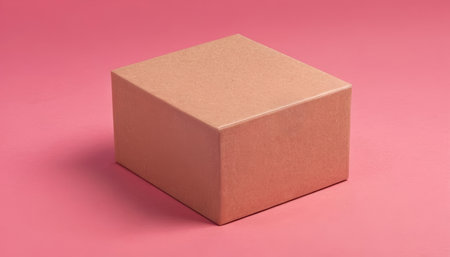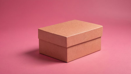 Closed cardboard box, brown in color, sits on a plain pink surface. Premium photo mockup for elegant and clean cardboard box product.