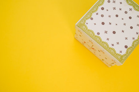 yellow gift box with open lid on black background with copyspace. High quality photo