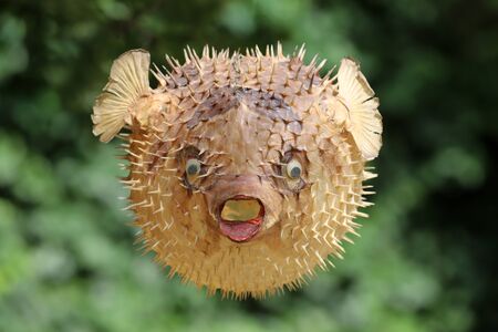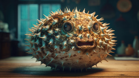 Stuffed dried puffer fish with sharp spikes on body on wooden table