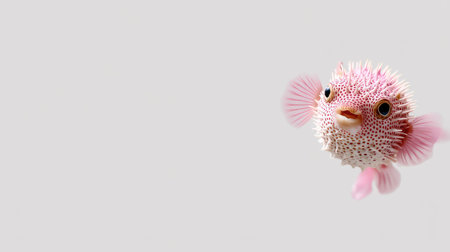 A charming pink puffer fish floats gracefully in an underwater setting, showcasing its vibrant colors and playful demeanor against a subtle grey backdrop.