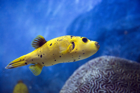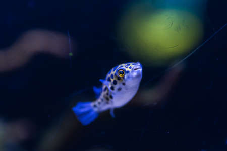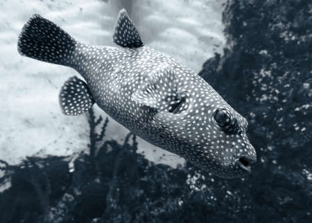 Close up of a blowfish swimming in the clear ocean. Natural background with beautiful lighting