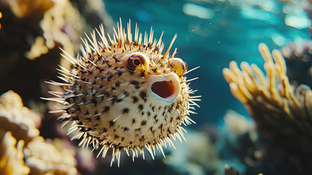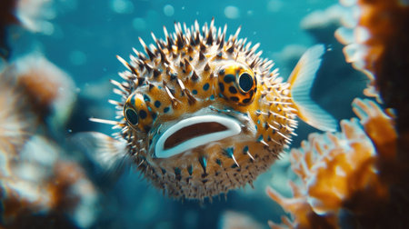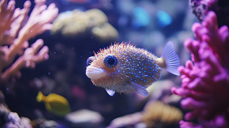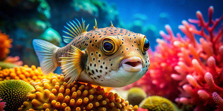 A stunning underwater scene featuring a colorful puffer fish swimming gracefully amidst a vibrant coral reef. The bright colors and intricate details create a mesmerizing view of marine life.