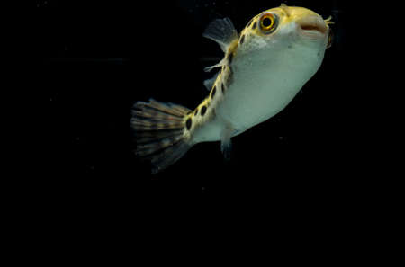 Spotted green pufferfish, tetraodon or Dichotomyctere nigroviridis on black background