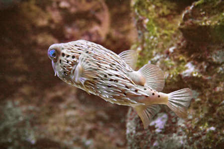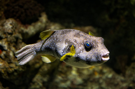 Spotted pufferfish (Arothron hispidus) with distinctive pattern swimming underwater. Marine aquarium species with yellow fins and dotted body