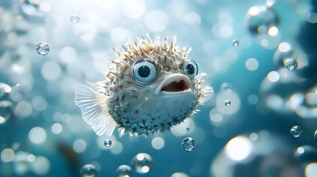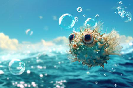 A puffer fish gracefully floats in the ocean, surrounded by bubbles, A whimsical blowfish playfully blowing bubbles at the sea surface, AI Generated