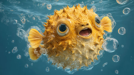 Dive into the vibrant underwater world with this cheerful yellow puffer fish, showcasing its playful personality amidst bubbles and captivating clarity.
