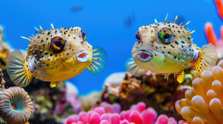 This captivating underwater scene features two vibrant puffer fish swimming gracefully among colorful coral formations, showcasing the beauty of marine life.