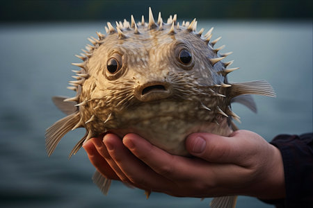 Poisonous puffer Fugu fish is lying on the palm of hand