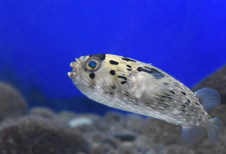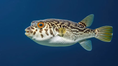 This image showcases a pufferfish, its body covered in unique patterns, against a deep blue backdrop. The fish displays distinctive markings and textures, illuminated with subtle lighting. Suitable for various visual projects, this image could be used for educational materials or design purposes.