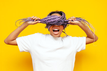 young african american woman with dreadlocks covers her face with her hair and hides on a yellow isolated background, a girl with a unique hairstyle and colored braids is shy and screaming