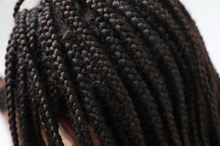 Texture of thin brown African braids, hair close-up braided in pigtails dreadlocks, Afro style
