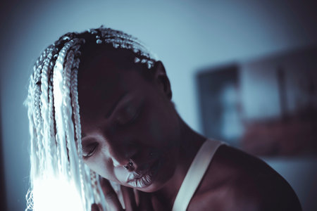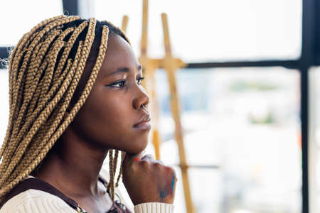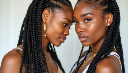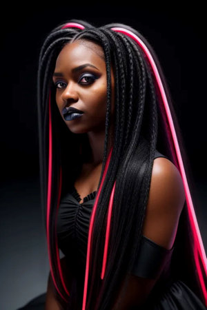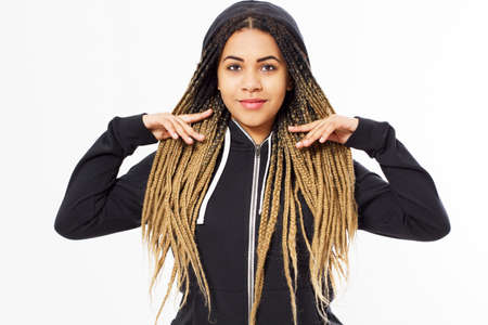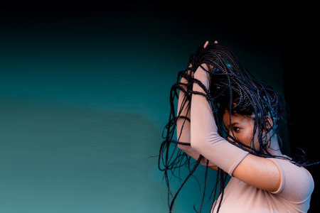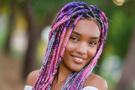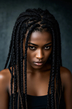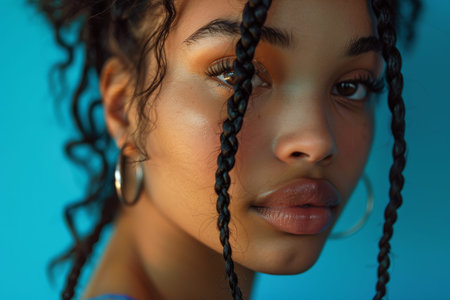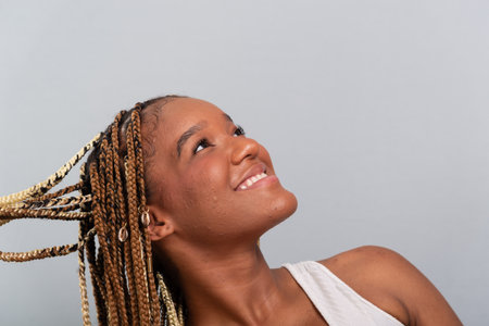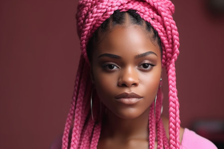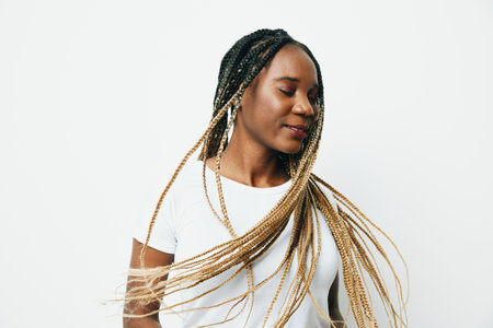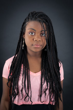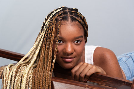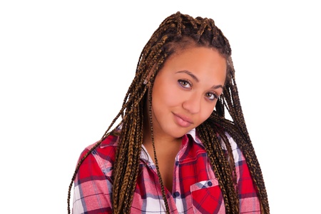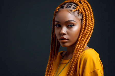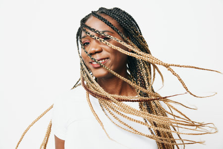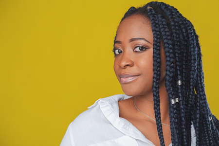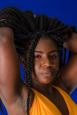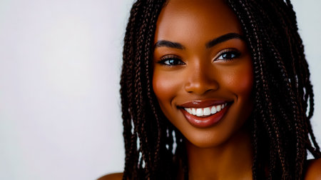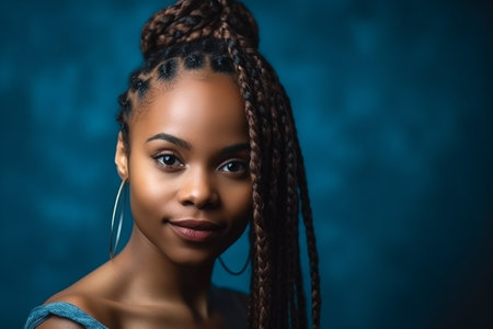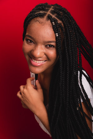 closeup portrait of smiling young beautiful african american woman braid hair posing at studio looking at camera