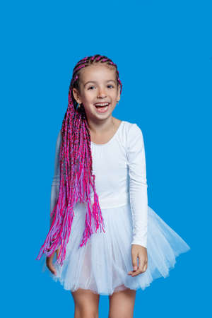 Smiling little girl with long pink hair, dressed in ballet white dress, on a blue background. Verical view. Copy space.