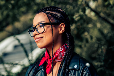 Lovely woman with braided hair and scarf, enjoying day outdoors in urban setting, expressing casual lifestyle and charm