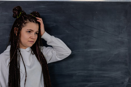 Confused Young Woman with Braids is Standing in Front of a Large Chalkboard in a Classroom