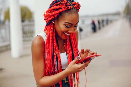 A young and stylish dark-skinned girl with red dreads sitting in the summer park