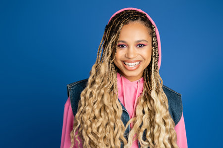 positive african american woman in pink hoodie and denim vest smiling on blue background, joy