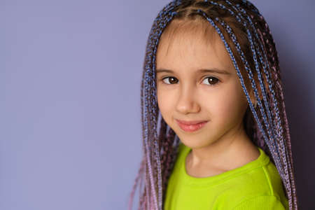 Portrait of a cute beautiful girl with blue-purple braided afro-pigtails. A child on a background of color very peri. Brown-eyed baby. Fashionable, stylish, bright hairstyle