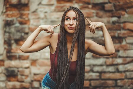 Cheerful young Caucasian woman, with long afro braided hair, is having fun and standing against the brick wall.
