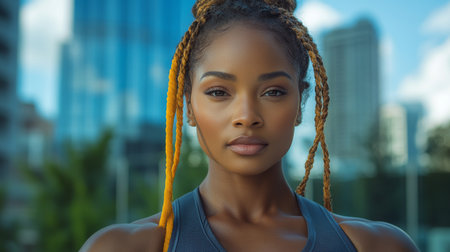 Portrait of smiling young african american woman with long blond braids. Copyspace.