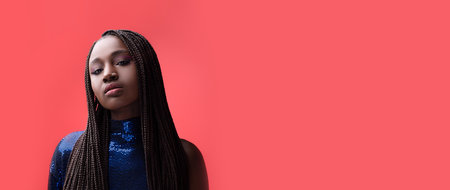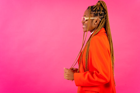 African young woman with braids on a pink background, portrait in the studio in a red suit