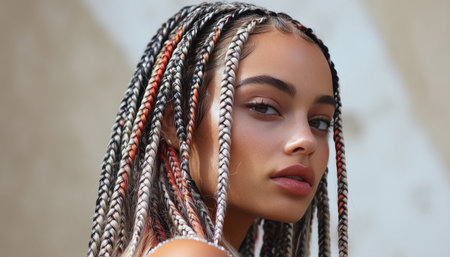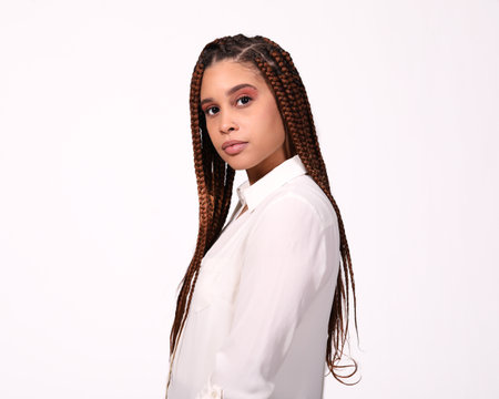 A young, fashionable woman with braided hair showcases her confident style while striking a pose in the studio.