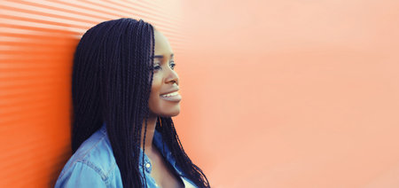 Portrait of happy smiling young african woman with dreadlocks, black girl looking away standing on an orange background in the city