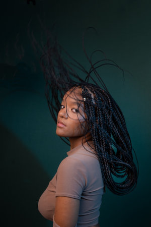 Beautiful young woman, sitting sideways, with braids of her hair flying. Isolated on dark cyan background.