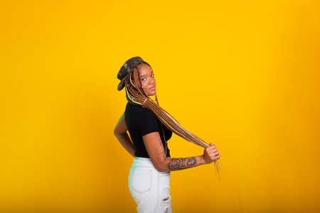 Lifestyle, attractive black girl with long braids, yellow t-shirts and short jeans on a yellow background. With sunglasses having fun, trap dancer