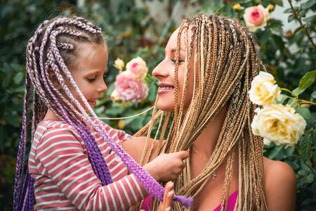 Happy smiling mother with her little daughter with plaits. Hair in trendy weave plait. Lifestyle portrait mom and daughter in happy mood at the outside.