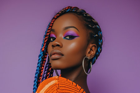 Vertical close up portrait of young woman with afro braids looking at camera against purple