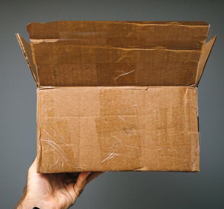 Man hand holding open cardboard box after before unboxing with protective paper carton