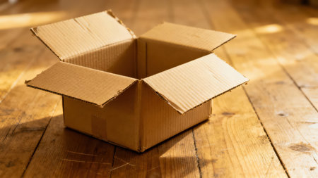 Shallow depth of field shot showing an open, empty shipping container made of brown corrugated material placed on vintage wooden floorboards under directional interior light.